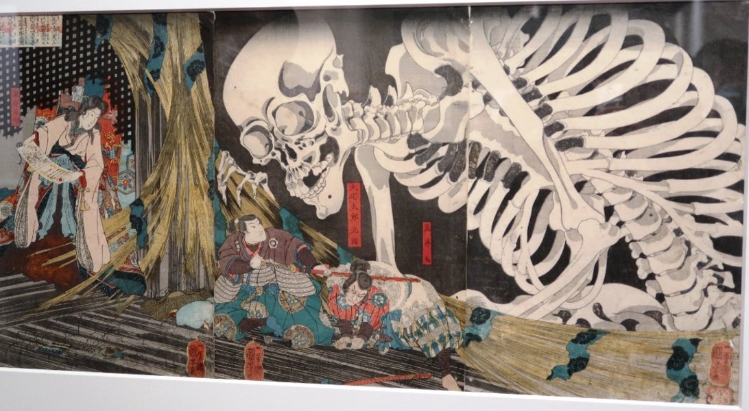 平将門の遺児・滝夜刃姫(たきやしゃひめ)が妖術で大矢光国に怪異を仕掛ける図、巨大で迫真に富む骸骨の登場場面。~将門の遺児の存在を初めて知った~。
