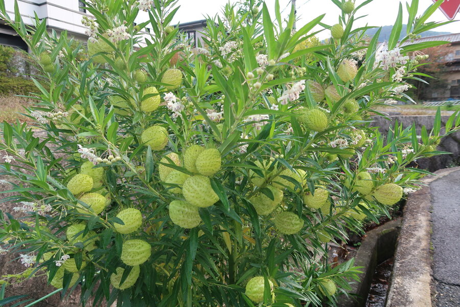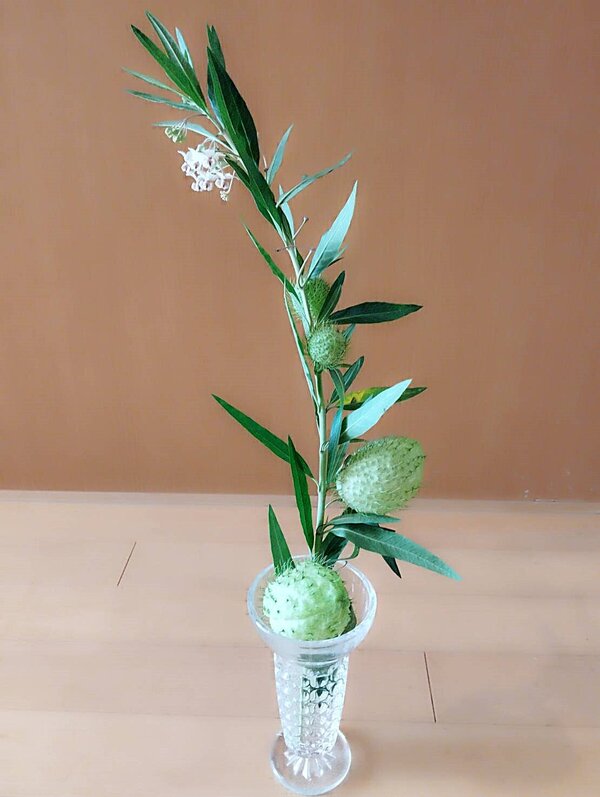 修学院道を東へ歩いている時に道端で目にとまった「フウセントウワタ」。大変珍しい花なのでカメラを向けていると、持主さんが親切に近くの甕水につけておくので、よければ帰りに持ち帰りなさいと二枝を切って下さった。トゲトゲをもつ丸い実の形が なんともユニーク。 実はカパッと割れて中から綿毛とタネが出てくる。
