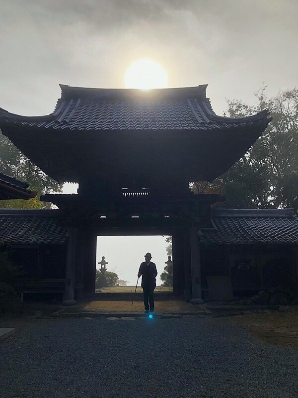 霧に包まれた鐘楼門(屋根に旭日、地上にシルエット)