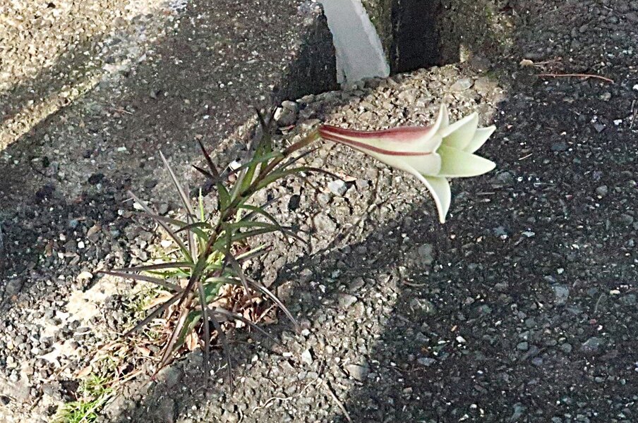 道端のコンクリートから顔をだす可憐な百合の花。道行く人に何かを話しかけるかのようです。たくましいのは雑草だけではありません。人間もあらゆる困難や災害に負けず強く生きよう!