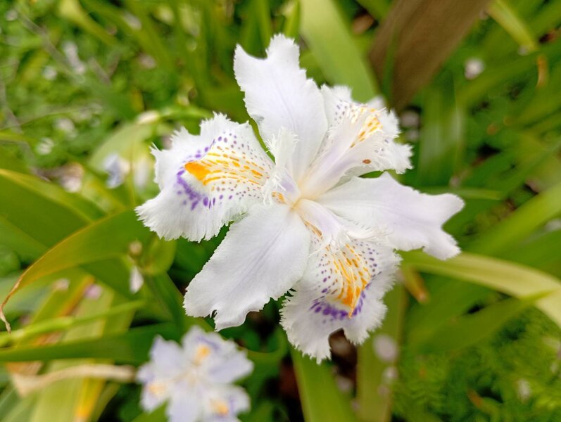 白紫色の花には黄色い斑点があり、ふちには糸状の細かい切れ込みがある。